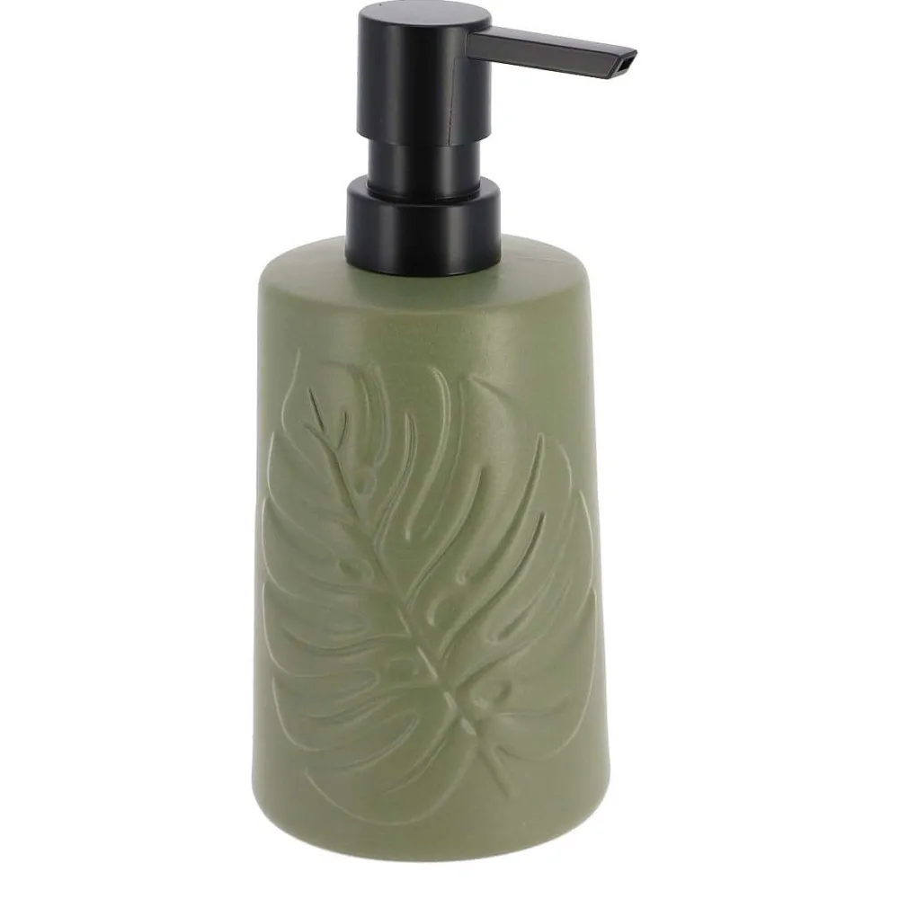 Accessoires De Salle De Bain|* Distributeur A Savon Gres Rond Décor Feuille 430Ml Kaki
